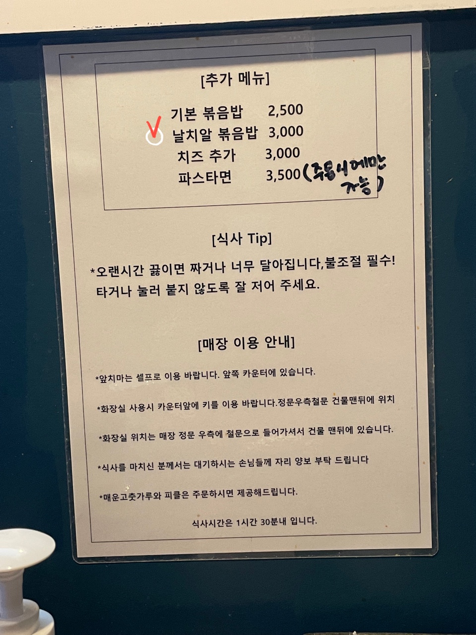 추가메뉴와 조리 팁과 여러 안내문구가 적혀있었어요