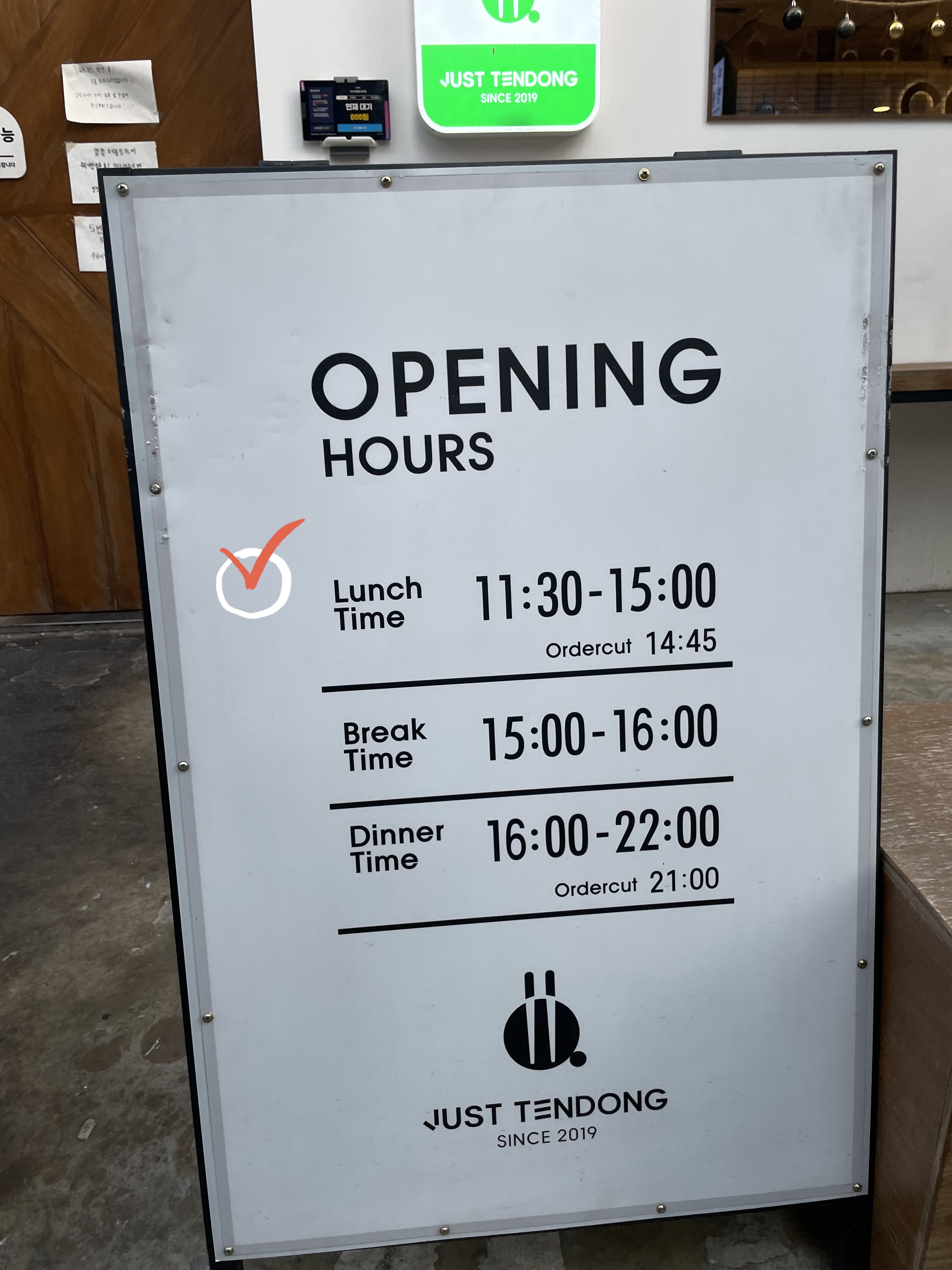 휴일없이 매일매일 오픈, 마감, 브레이크타임이 동일한 저스트텐동이네요!