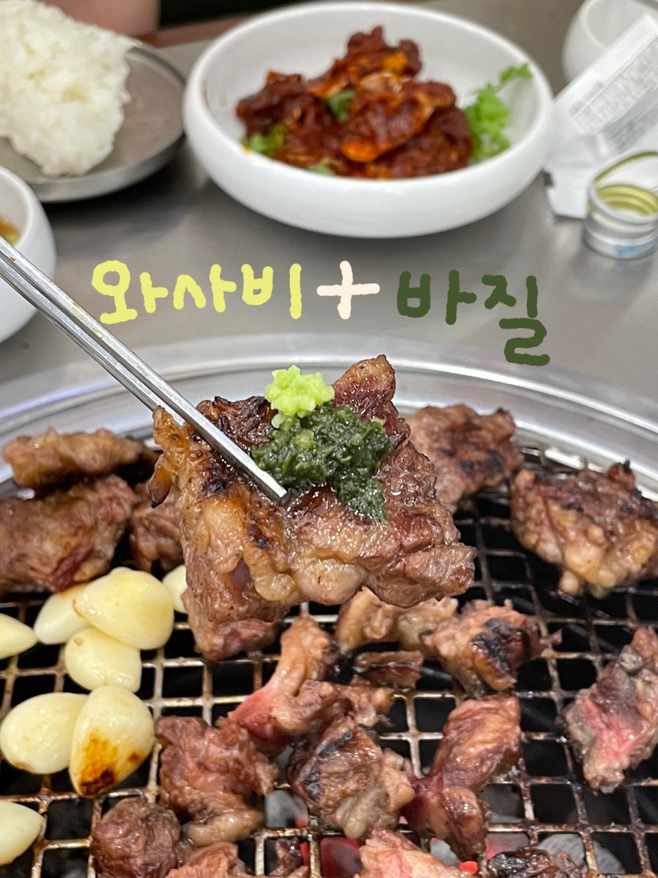 고기가 구워지면 간장에 찍어 바질과 와사비를 같이 먹으면