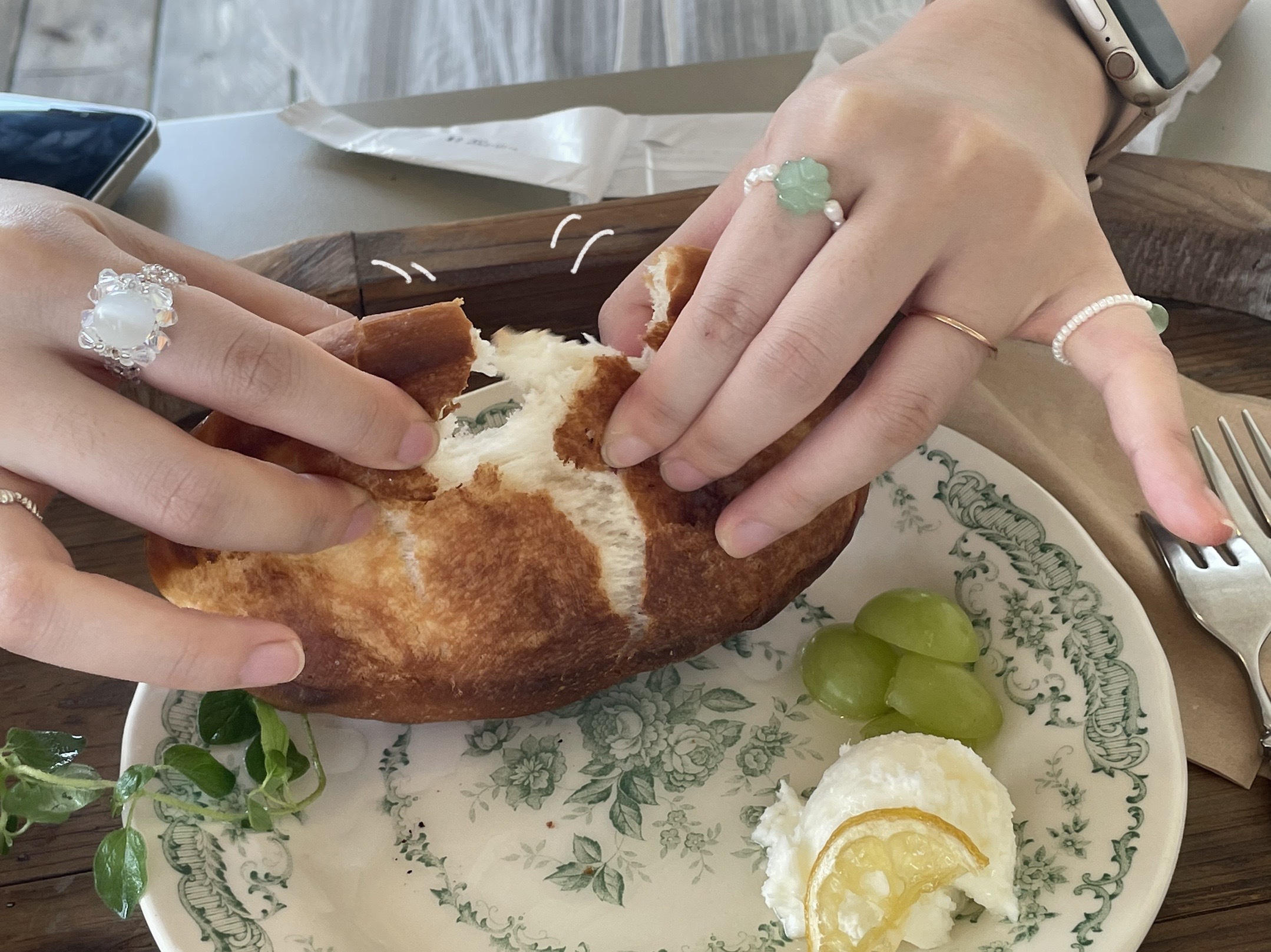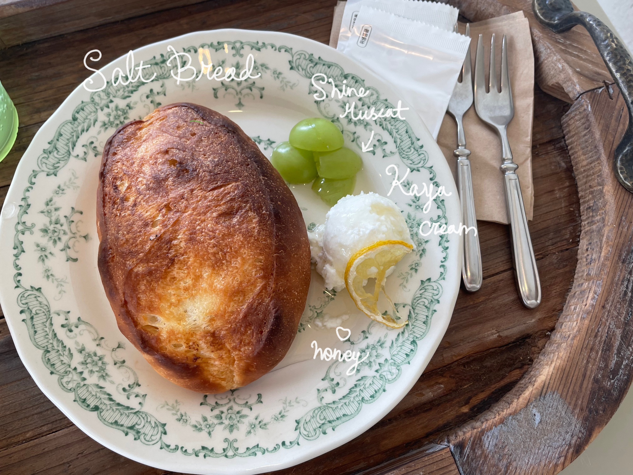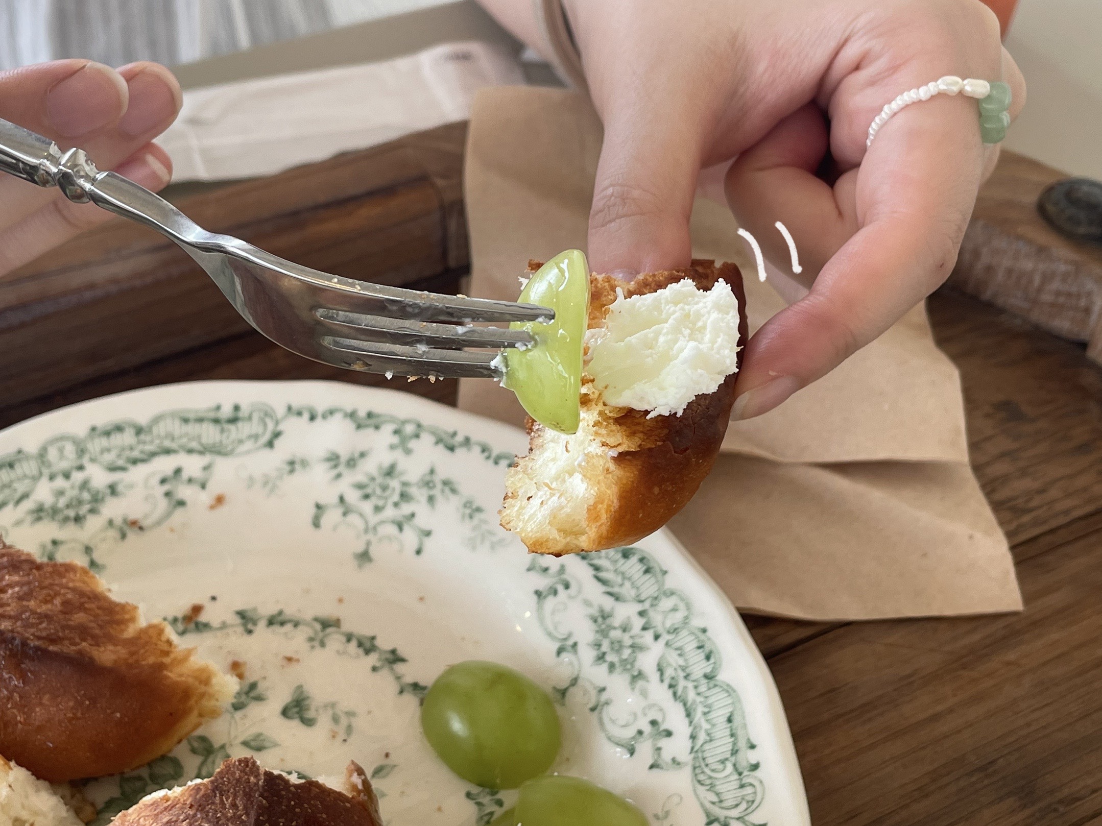 바삭하게 구워진 빵과 함께 곁들여진 샤인머스켓과 카이막!