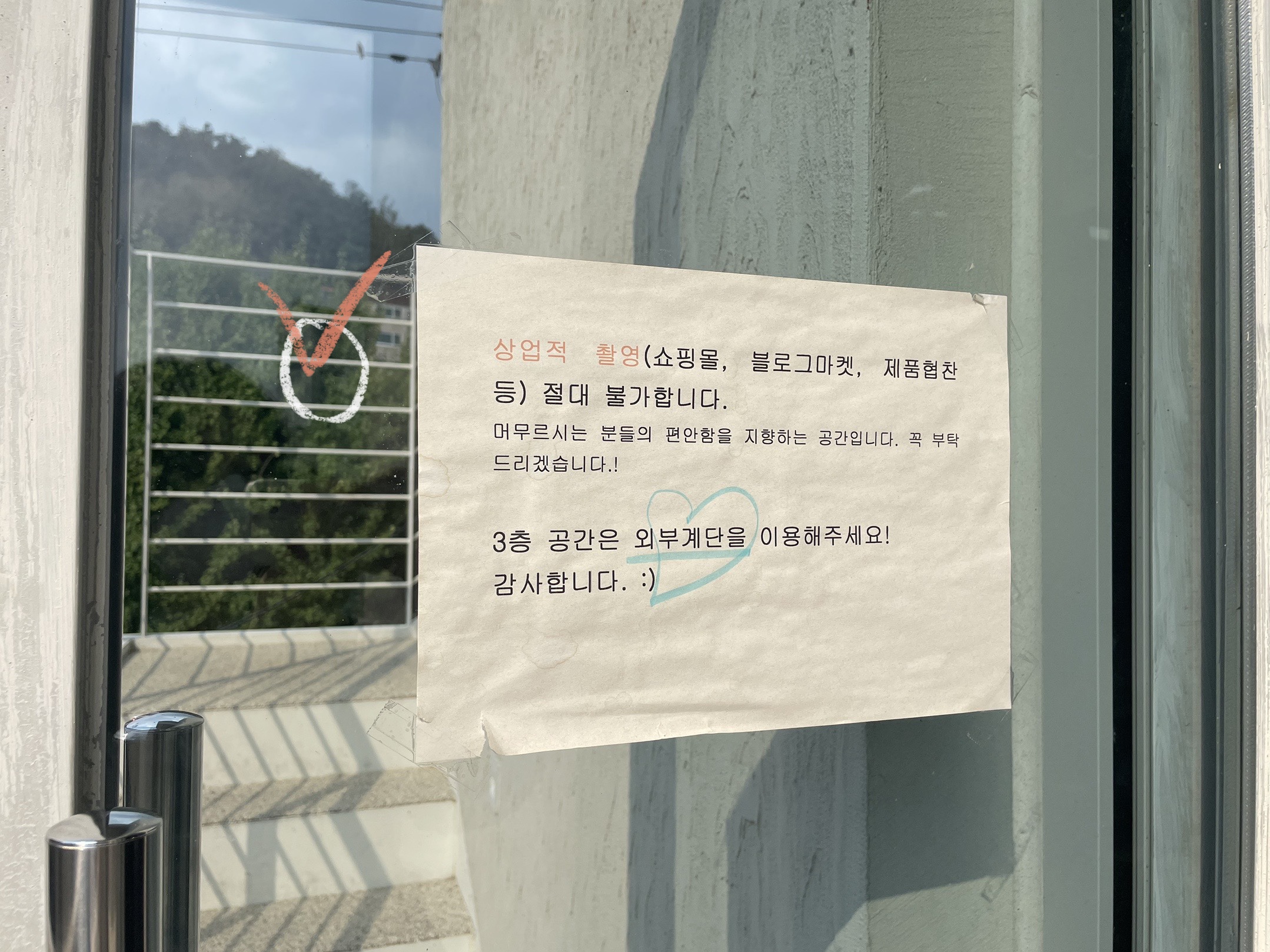문에는 상업정 촬영이 불가하다는 안내문구가 적혀있었어요~