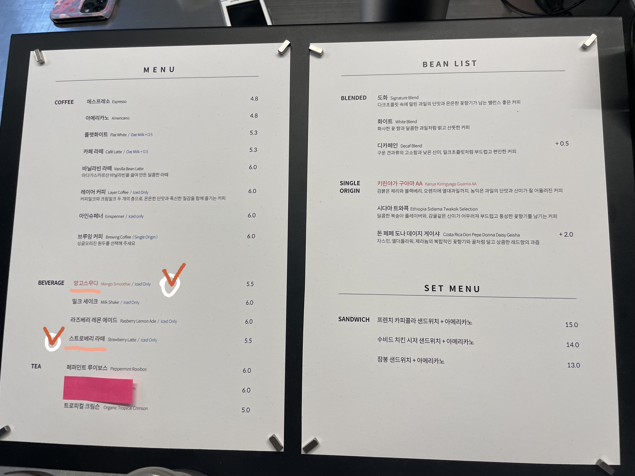여러 종류의 음료 중 망고스무디와 스트로베리 라떼를 픽한 듀링과 민도동생!